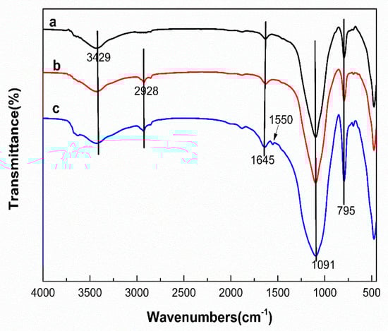 FT-IR spectra of silica clay (SC), 3-aminopropyltriethoxysilane (APTES)-modified SC (A-SC), and the immobilized lipase on glutaraldehyde-activated A-SC (Lip–Glu–A-SC) are shown in Figure 1. For the pure silica clay (Figure 1a), the bands at 3429 cm-1 and 1645 cm-1 were assigned to the Si–OH stretching and bending vibrations []. While the bands at 1091 cm-1 and 795 cm-1 were assigned to the Si–O stretching vibration and Si–O–Si symmetrical stretching vibration, respectively. For the A-SC (Figure 1b), the characteristic band at 2928 cm-1 is associated with the bending vibration of C–H from (APTES), thereby implying that the APTES was successfully coated onto the support []. For the spectrum of Lip–Glu–A-SC (Figure 1c), the band at 1645 cm-1 is assigned to the amide I band arising from the lipase protein. Furthermore, a new band that appeared at 1550 cm-1 could be due to the amide Ⅱ band []. The results confirm that the modification and immobilization processes were successful.