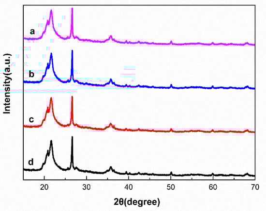 The N2 adsorption–desorption isotherms obtained for the pure SC and Lip–Glu–A-SC are presented in Figure 3. The isotherm profiles were evaluated to be type-IV and have a type-H3 hysteresis loop, which is characteristic of mesoporous substances []. The pure SC had a BET surface area of 73.56 m2/g, while that of Lip–Glu–A-SC decreased to 42.97 m2/g, which was in good agreement with the previously reported values []. However, the average pore size and pore volume was the same for both. The results illustrate that the modification and immobilization processes occur only on the surface of the support, which is in good agreement with the TEM results. The XRD profiles of SC, A-SC, Glu–A-SC, and Lip–Glu–A-SC are shown in Figure 4. The main component of SC is silicon oxide, which is an amorphous material with characteristic wide peaks within the 2θ range of 15°~30° [,,]. The XRD patterns are principally characterized by a wide peak centered at 21.65°. The peak centered at 26.57° can be ascribed to a small percentage of crystal impurities, with similar results having been reported in the previous literature. The XRD results indicate that the modification, crosslinking, and immobilization processes did not destroy the structure of the support, which also confirmed the successful immobilization of lipase.