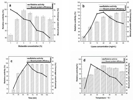 The effects of contact time on the immobilization process were assessed with a glutaraldehyde concentration of 2% and a lipase concentration of 15 mg/mL at 30 °C and pH 7.5 by varying the contact time. The effect of contact time on the immobilization process is shown in Figure 5c. It can be seen that the relative activity reached the maximum in 60 min and maintained a fast growth rate before 60 min. The growth rate gradually slowed after 60 min. The amount of bound protein reached a relatively high value at 60 min. The effects of temperature on the immobilization process were assessed for a glutaraldehyde concentration of 2% and lipase concentration of 15 mg/mL at pH 7.5 for 60 min by varying the temperature from 20 to 50 °C. As illustrated in Figure 5d, the bound protein tended to increase with the increase in the temperature ranging from 20 to 30 °C, reaching the maximum immobilization efficiency at 30 °C. However, at a temperature higher than 30 °C, a relatively large decrease in bound protein was observed. The highest activity was acquired at 25 °C.