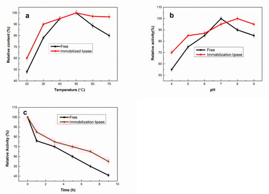 Figure 6b shows the activities of free and immobilized lipases that were kept in phosphate buffer solution (0.1 mol/L) at 40 °C. To compare with the free lipase, the optimal pH value of immobilized biocatalyst shifted from 7.0 to 8.0. This change may be due to the covalent crosslinking technique. The relative activities of immobilized lipase remained at a high level within the pH range of 4.0 to 9.0, implying that the support expressed inertly, protecting lipase from inactivation or denaturation and remaining in its active form.