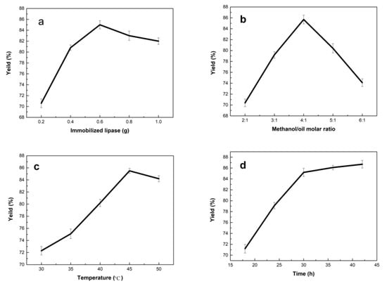 The factors related to the conversion yield of biodiesel are shown in Figure 7. The conversion yield of biodiesel increased from 70.6% to 85.0 % when the dose of the immobilized lipase (11.5 mg protein per gram of immobilized lipase, see Figure S1) increased from 0.2 to 0.6 g (Figure 7a). As the dose of immobilized lipase was over 0.6 g, the conversion yield decreased slightly. This result may be due to the fact that an excess of immobilized lipase reduces the mass transfer efficiency of the reaction. This result may be due to the fact that an excess of immobilized lipase reduces the mass transfer efficiency []. Therefore, the dose of the immobilized lipase was set at 0.6 g in the following experiments.