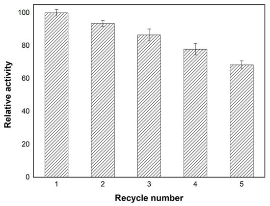 The effect of recycling immobilized lipases on their activity is described in Figure 8. The catalytic efficiency of the immobilized lipase in the transesterification process only exhibited a small decrease and more than 67% of the activity can was retained after five cycles.