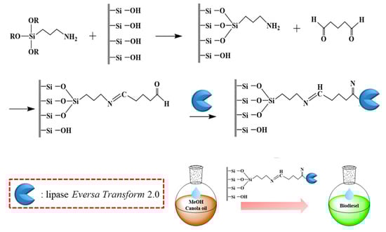 Lipase Eversa Transform 2.0 (E.C. 3.1.1.3) was obtained from Novozymes China (Beijing, China). 3-aminopropyltriethoxysilane (APTES) and n-hexane (chromatographic grade) were purchased from Aladdin (Shanghai, China). Methyl heptadecanoate was purchased from Sigma-Aldrich China (Shanghai, China). Silica clay (SC) was obtained from Create New Material Company (Ningbo, China). The canola oil (99.9% fat, 0% free fatty acid, 0% protein, and 0% water) was purchased from a local market (Chengdu, China). All other reagents were of analytical grade and were used without further purification.