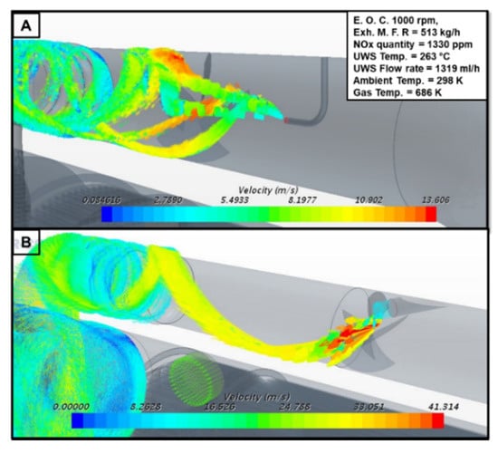 Urea distribution phenomena in the SCR system: (A) L-type urea injector and (B) I-type urea injector.