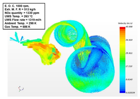 Our experiments involved two types of urea injectors for a heavy-duty diesel engine—a Hyundai D6CC, operated at 1000 rpm, the highest possible performance. Our simulations used the commercial computational fluid dynamics (CFD) code of STAR-CCM+ version 11.04, with which the flow factors, temperature factors, and urea decomposition factors, which can affect the quality of the urea decomposition process in the system [6,7,8,9,10,12], were thoroughly examined.