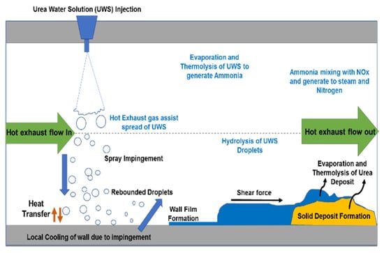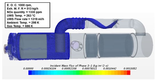The amounts of ammonia and isocyanic acid introduced into the catalyst were similar, and the amount of urea was observed under their experimental conditions [13]. In this study, the UWS is described with an evaporative approach to urea water solution (~60% water (H2O) and ~40% urea); the concentrations of fluid masses are defined in each computational cell to represent the mass distribution in the SCR system.