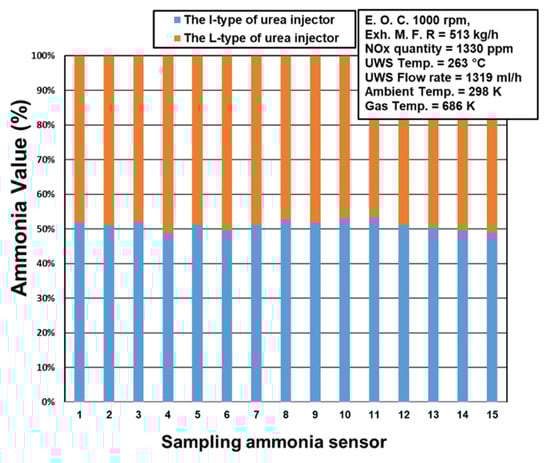 Experimental results of ammonia uniformity in the catalyst inlet: (A) L-type urea injector and (B) I-type urea injector.