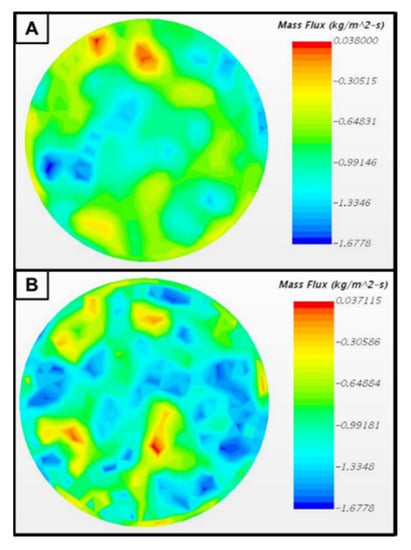 The distribution gas in this study was described in the previous section. The quality of the urea process is reflected in the quantity of solid depositions that occur in the system. In commercial SCR systems, the H2O and urea are usually difficult to evaporate [1,6,14]: The urea particles easily attach to and settle on the system walls, and this process is the main source of solid deposits in SCR systems. However, this study found that urea was evaporated well. Figure 4 shows the lower quantity of mass flux slip in the system, which demonstrates that the gas particles were distributed to the catalyst with hardly any urea particles becoming deposits in the system. This was possible because mass flux simulations can identify any abnormal distributions of gas particles in a system.