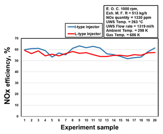 The quality of the urea process also can be described with the NOx reduction efficiency derived from the experimental results. The quality of the urea evaporation process is reflected by the NOx concentration in the outlet catalyst, as determined in this study with the Horiba MEXA-7100 DEGR emission analyzer, as shown in Figure 5. The I-type urea injector used in this system produced 5% more ammonia than the L-type injector. This value supports our simulation results in the previous section that suggest that I-type injectors are better than L-type injectors in terms of improving the ammonia generation process.