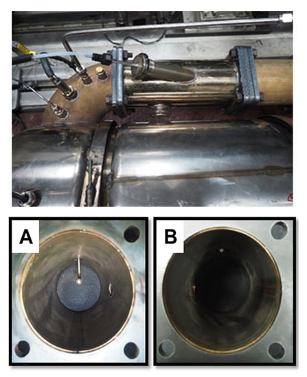 The urea injectors inside the SCR system: (A) L-type (original type) and (B) I-type (improved type).