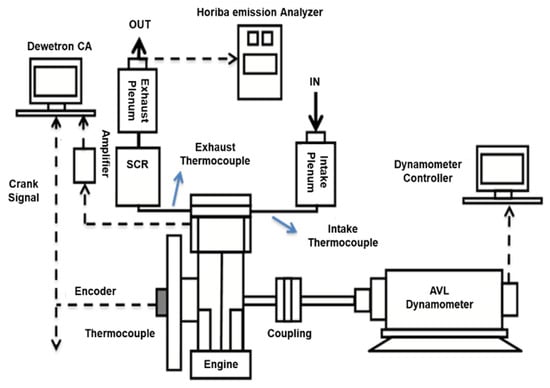 In this study, the experimental setup used a six-cylinder, four-cycle diesel engine that was water-cooled with natural aspiration. The operating condition was restricted to 1000 rpm because the performance maximum of this type of diesel engine is 1200 rpm. At 1000 rpm, the engine can produce a mass flow of 513 kg/h, yielding NOx of 1330 ppm. This parameter followed previous research [1,6,7,15], and it can be used to compute the reduction of NOx in the system. The heavy duty engine specification of this experiment are listed in Table 2. The experimental setup and schematic diagram are shown in Figure 15 and Figure 16.