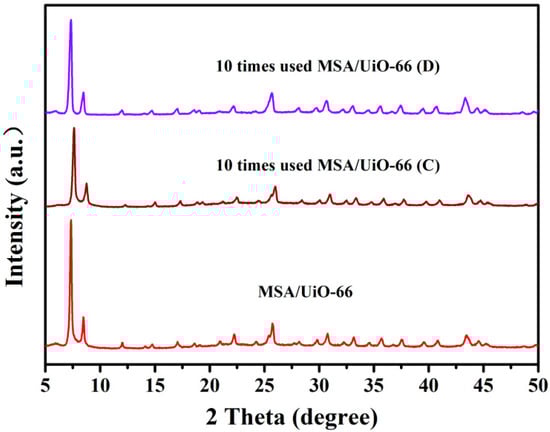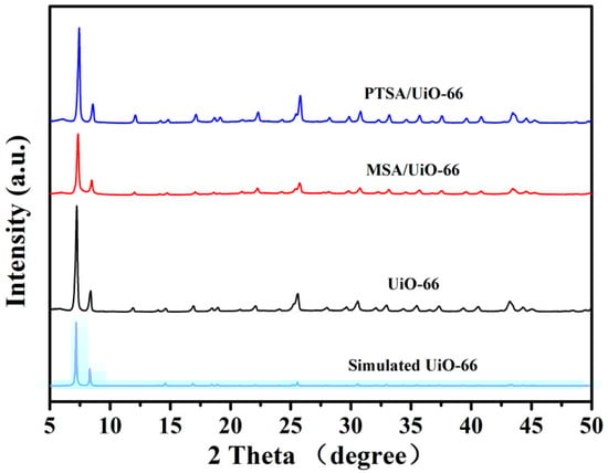 The degree of crystallinity of the UiO-66 and the UiO-66-supported sulfonic acid species MSA/UiO-66 and PTSA/UiO-66 was evaluated by XRD (Figure 1).