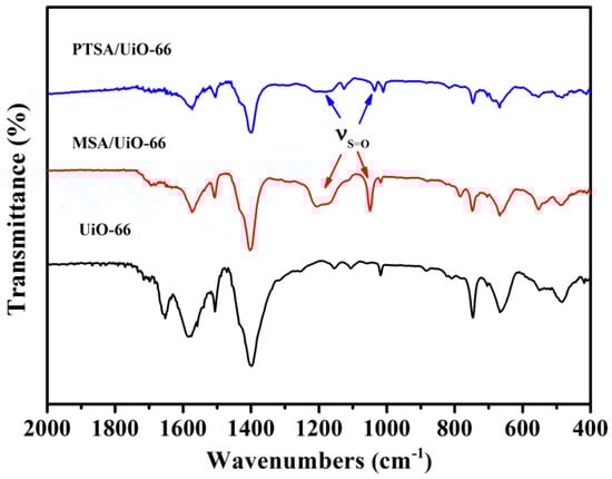 FT-IR analysis was used to evaluate the PTSA and MSA supported on UiO-66 (Figure 2). The results showed that the characteristic absorption peak of the proton carboxyl group (1760 ~ 1690 cm−1) in UiO-66 did not appear, while the carboxyl symmetric stretching vibration (1398 cm−1) and asymmetric stretching (1576 cm−1) vibration absorption peak of the carboxyl ligand were present, indicating that the carboxyl acid existed in a complex form in the UiO-66. The absorption frequency at 1205 cm−1 and 1050 cm−1 in both PTSA/UiO-66 and MSA/UiO-66 were ascribed to the stretching vibration of -SO3 groups, implying PTSA and MSA were successfully supported in UiO-66.