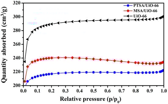 The porosity of UiO-66, PTSA/UiO-66 and MSA/UiO-66 was evaluated with N2 adsorption-desorption analysis (Figure 3).