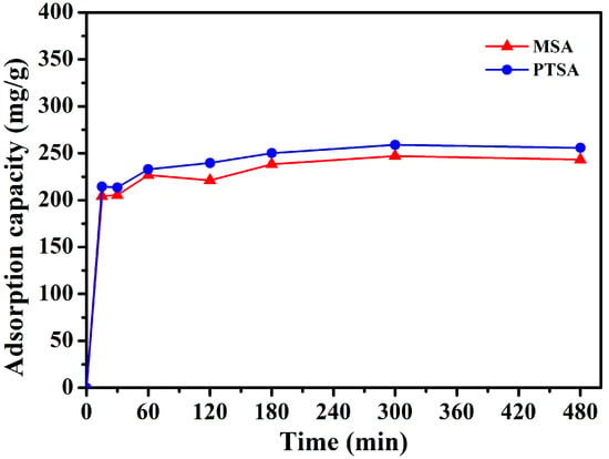 The amount of organosulfonic acids (PTSA or MSA) in the UiO-66-supported acids (PTSA/UiO-66 and MSA/UiO-66 was evaluated through determination of sulphur in UiO-66 by elemental analysis. The adsorption capacity of PTSA and MSA on UiO-66 was also successfully tested by elemental analysis (Figure 4). The sulphur contents in UiO-66 increased as the impregnation time increased (0–5 h), indicating the contents of PTSA or MSA in UiO-66 increased. Absorption equilibrium of PTSA and MSA was achieved at about 5 h, and the average content of PTSA and MSA supported in UiO-66 were 258.9 ± 5.6 mg/g and 247.1 ± 2.1 mg/g, respectively.