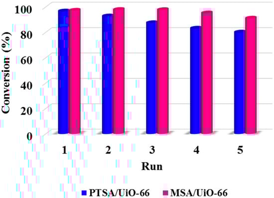 Up to now, examples of the use of sulfonic acids-on-UiO-66 prepared through impregnation approaches as esterification catalysts are rare [,]. In this work, an impregnation approach was used to prepare UiO-66 MOF-supported organosulfonic acids (PTSA, MSA) which were evaluated in esterification reactions for biodiesel production, and the reusability of the solid catalyst was investigated.