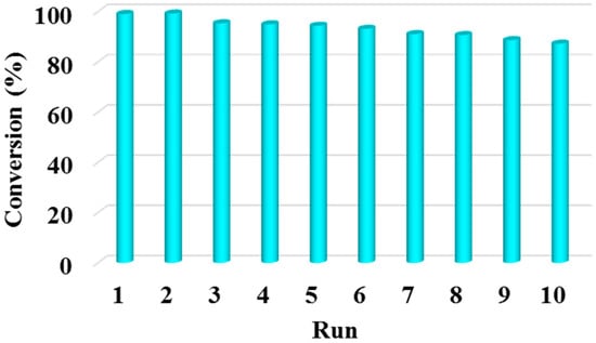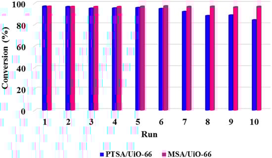Methanol is an alcohol with high polarity, which will slightly decrease the recycling effect of the developed solid acid catalysts (PTSA/UiO-66 and MSA/UiO-66). Therefore, lowering the polarity of short chain alcohols will reduce the leaching of organosulfonic acid from the solid catalysts. The fatty acid esters of n-butanol were also found to act as as emollient and solvent/diluent in chemical products and cosmetics []. n-Butyl biodiesel is also considered as an environmentally friendly fuel because of n-butanol can be produced by biological fermentation []. Thus, the esterification reaction of palmitic acid with n-butanol was selected to examine the catalytic activity of solid acid catalyst (MSA/UiO-66). As shown in Table 4, MSA/UiO-66 presented a preferable catalytic activity with the conversion of PA up to 99.2% under the typical reaction conditions (temperature, 100 °C; time, 2 h; amount of catalyst, 25 g/mol; molar ratio of n-butanol to PA, 3:1). The results of recycling experiments through approach 1 are shown in Figure 10. The esterification conversion decreased to 93.1% after 9 reuses without any post-processing. The elemental analysis demonstrated that the MSA content in the MOF catalyst was 204.7 mg/g after 10 runs. These results indicated that MSA/UiO-66 had preferable catalytic and recycling activity towards esterification reaction of palmitic acid with n-butanol.