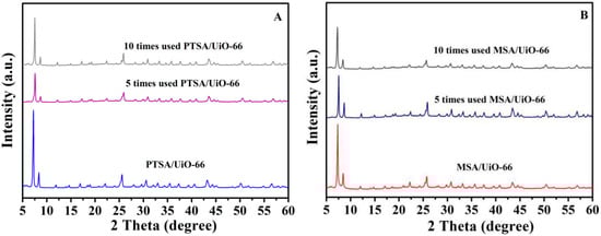 XRD patterns of the used PTSA/UiO-66(A) and MSA/UiO-66(B).