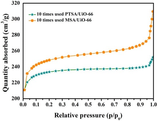 The stability of PTSA/UiO-66 and MSA/UiO-66 catalysts (used 10 times) were determined by XRD (Figure 8). The XRD patterns of the used catalysts (PTSA/UiO-66 and MSA/UiO-66) were almost identical to the fresh PTSA/UiO-66 and MSA/UiO-66, indicating that PTSA/UiO-66 and MSA/UiO-66 had high stability in the esterification of PA with methanol. The N2 adsorption-desorption of PTSA/UiO-66 and MSA/UiO-66 (used 10 times) was also determined (Figure 9 and Table 3). After reuse 10 times, the Langmuir surface area and total pore volume of catalysts showed no change, while the average pore width of catalysts were a little bigger than the original catalysts (Table 3). The above results indicated that the solid catalysts using UiO-66 as platform retained its original crystalline structure and exhibited strong stability in the esterification reaction.