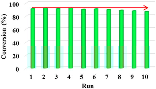 A long chain fatty alcohol such as n-decanol was also examined as esterification partner with palmitic acid in the presence of UiO-66-supported acid (MSA/UiO-66). The results showed that MSA/UiO-66 also had good catalytic activity in the esterification of n-decanol with palmitic acid. Notably, a 99.9% conversion of palmitic acid (PA) was detected under the conditions of temperature, 120 °C; time, 2 h; amount of catalyst, 25 g/mol; ratio of n-decanol to PA, 2:1. The conversion of PA was decreased to 91.4% with the reaction temperature decreasing to 100 °C. The recycle verification experiments were conducted at 100 °C under Approach 1 method conditions (separating the catalyst first). The results showed that a little decline after 10 runs was observed and the conversions of PA were around 90% (Figure 11), indicating that MSA/UiO-66 had both excellent catalytic activity and recycling activity in the esterification reaction of PA with n-decanol. In addition, elemental analysis showed that the content of MSA in the solid catalyst was 209.3 mg/g after ten runs. These results verified that low polarity of alcohols (e.g., n-decanol, n-butanol) decreased the leaching of organo-sulfonic acids in the esterification reaction, which resulted in better recoverability of MSA/UiO-66.