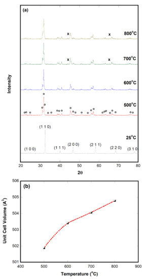 In-situ XRD results of SrFeO3−δ: (a) In-situ XRD powder pattern and (b) unit cell volume at 500 ≤ T ≤ 800 °C. The symbols indicate Fe metal (x) and brownmillerite (o).