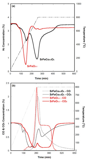CO2 decomposition results: (a) Consumed H2 concentration and (b) CO2 and CO concentrations during sample activation and CO2 decomposition tests, respectively. The black lines indicate the results of SrFeCo0.5Ox extracted from our previous work [17], and the straight dotted lines indicate temperature profiles (i.e., 3 °C/min).