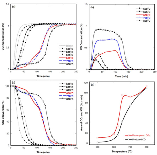 Although Figure 3c illustrates the same data in the same format as Figure 3a, the conversion degree is easier to distinguish from the CO2 conversion plot. Furthermore, ≥90% of CO2 conversion lasted for ≈65 min at 650 °C. This drastic change was much more evident from the area plots of the decomposed CO2 and produced CO shown in Figure 3d. We calculated these areas by subtracting those obtained in the isothermal blank tests. It should be noted that the area for CO2 (i.e., amount of CO2 decomposition) was unusually high at 650 °C. It was even slightly higher than that at 700 °C. Further, CO production increased rapidly until the temperature was increased up to 800 °C. The shape of the isothermal CO2 decomposition curve at 650 °C also slightly differed from those of the others. We plan to analyze these behaviors using temperature-programed reduction and temperature-programed oxidation in a separate paper.