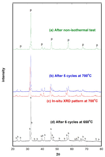 XRD powder patterns of SrFeO3−δ tested for CO2 decomposition measurements: (a) After nonisothermal test, (b) after five cycles at 700 °C, (c) in-situ XRD at 700 °C, and (d) after six cycles at 650 °C. The symbols indicate perovskite (p) and brownmillerite (b).