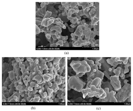 SEM images of SrFeO3−δ: (a) Before the redox test, (b) after six cycles of redox measurements at 650 °C, and (c) after five cycles of reproducibility tests at 700 °C.