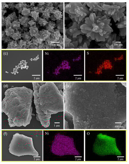 SEM images of (a,b) NiS and (d,e) Ni(OH)2; elemental mapping images of (c) NiS and (f) Ni(OH)2.