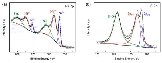 To gain information on the chemical states of NiS, XPS measurements were carried out and the high-resolution Ni 2p and S 2p spectra were fitted by the Gaussian method. As shown in Figure 3a, the Ni 2p spectrum can be fitted with two spin-orbit doublets and two shark-up satellites (marked as ‘Sat.’). The binding energy at 853.4 eV in Ni 2p 3/2 and 870.6 eV in Ni 2p 1/2 correspond to the Ni2+, while the binding energy at 856.2 eV in Ni 2p 3/2 and 874.0 eV in Ni 2p 1/2 are the characteristic of Ni3+ [33]. For the S 2p spectrum of NiS (Figure 3b), the binging energy at 161.8 and 162.6 eV correspond to S 2p 3/2 and S 2p 1/2, respectively, indicating that the S element exists as sulfur anion in the NiS lattice [34]. Meanwhile, the peak at 168.6 eV is assigned to surface S−O bonds [35], which may originate from the partial surface oxidation while the sample is exposed to air. Based on the XPS results, the coexistence of Ni2+ and Ni3+ indicates that the exposed Ni sites on the surface of NiS catalyst are in a highly active state, which can offer rich redox reactions and hence lead to the enhanced electrochemical performance.