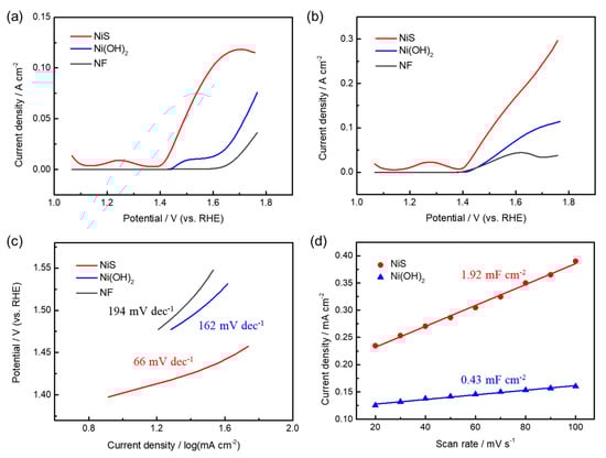 LSV curves of NiS, Ni(OH)2, and Ni foam (NF) in (a) 1 M KOH and (b) 1 M KOH with 0.33 M urea at the scan rate of 5 mV s−1; (c) Tafel plot and (d) double−layer capacitance of NiS and Ni(OH)2 in 1 M KOH with 0.33 M urea.