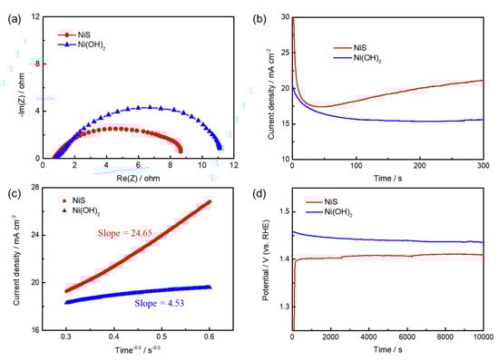EIS was used to study the charge transfer kinetics of NiS and Ni(OH)2 catalysts. The Nyquist plots (Figure 5a) were measured at the corresponding onset potentials of NiS and Ni(OH)2 catalysts with an amplitude of 10 mV in the frequency between 0.1 Hz and 100 kHz. The smaller diameter of the semi−circle means the lower charge transfer resistance in NiS, which is attributed to higher electrical conductivity of transition metal chalcogenide [34]. The improved electron transport in NiS renders facile redox transition between Ni2+ and Ni3+, which is crucial for oxidizing urea and regeneration of Ni2+ sites. Moreover, the chronoamperometry plot (i−t plot) of NiS measured at 1.42 V in 1 M KOH containing 0.33 M urea is shown in Figure 5b. The diffusion coefficient of urea (D) can be calculated based on the equation: