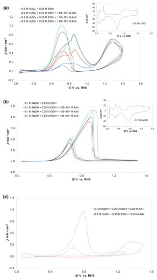 The cyclic voltammetric behavior of the influence of acetonitrile on the process of ethanol electrooxidation (at 0.25 M C2H5OH) on a polycrystalline Pt electrode surface in 0.5 M H2SO4 and 0.1 M NaOH solutions is shown in Figure 1a–c below. For the experiments carried out in sulphuric acid supporting electrolyte, two oxidation peaks, centered at ca. 0.80 and 1.30 V vs. a reversible Pd hydrogen electrode (RHE), appear upon an anodic sweep (see the green plot in Figure 1a). Then, when the Cyclic Voltammetry (CV) sweep is reversed towards the hydrogen reversible potential, a single anodic peak, centered at about 0.60 V, appears in the CV profile. Ethanol electrooxidation follows a surface adsorption step of ethanol molecules, which most likely takes place over the potential range of ca. 0.20–0.40 V, partly in parallel with underpotentially deposited (UPD) H ionization from the Pt surface (see an inset to Figure 1a). The lowest potential oxidation peak (0.60 V) is typically assigned in the literature to the process of the oxidation of surface-adsorbed COAds species, while that observed at 0.80 V is assigned to the formation of acetaldehyde [,,,]. On the contrary, the highest potential anodic peak, observed over the potential range of 1.10–1.50 V, corresponds to the oxidation process with the involvement of surface-adsorbed, oxygen-based species.