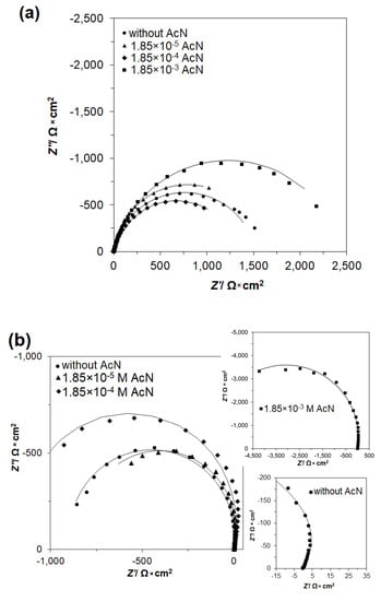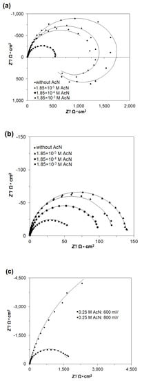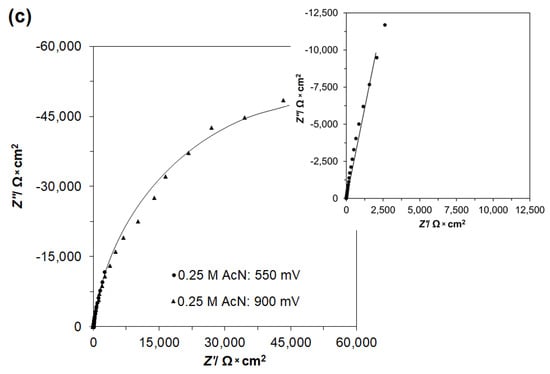 A single partial semicircle (related to the process of ethanol electrooxidation in H2SO4) appears at the potential of 550 mV in the Nyquist impedance plot (see Figure 2a and Figure 3a below). It should be noted, however, that a radical detrimental effect of acetonitrile on the recorded charge-transfer resistance Rct parameter could only be observed for the two highest AcN concentrations of 1.85 × 10−3 and 0.25 M AcN. Here, the Rct resistance values were 1524, 2460, and 131,404 Ω × cm2 for AcN-free, 1.85 × 10−3, and 0.25 M AcN (see Figure 3c) working in 0.5 M H2SO4 + 0.25 M C2H5OH electrolyte, correspondingly. This behavior reflects a prevailing, acetonitrile Pt surface adsorption effect over that for ethanol molecules (also see Scheme 1 above), being simultaneously in line with the cyclic voltammetry features observed in Figure 1a. Then, for the potential ranges of 650–900 mV ([AcN] = 0 and 1.85 × 10−5 M) and 700–900 mV ([AcN] = 1.85 × 10−4 and 1.85 × 10−3 M), the impedance spectra are characterized by two partial semicircles (an inset to Figure 3b shows an example of a high frequency arc). Here, the high frequency semicircle response represents the reaction charge-transfer process (Rct, Cdl), whereas a low frequency response would be associated with the surface adsorption of reaction intermediates (RAds, Cp). As can be seen in Table 1, all recorded RAds and also some high potential Rct resistances exhibited negative values (also refer to the corresponding Nyquist plots with a negative real impedance part in Figure 3b). The above is indicative of instability within the examined electrochemical system, which most likely involves surface oscillation of the adsorbed reaction intermediates (also see Refs. [,,,,] for details). Most importantly, increasing the AcN concentration (along with rising AcN platinum surface adsorption) generally caused augmentation of the Rct and RAds resistance parameters (their absolute values), where simultaneously absolute values of the adsorption resistance parameter became considerably reduced upon a rising electrode potential (see Table 1 for details).