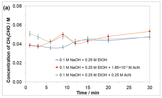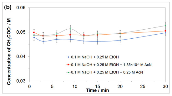 Figure 5a,b below present the changes of CH3CHO and CH3COO- concentrations, recorded as the time of the ethanol electrooxidation process in 0.1 M NaOH-based solution, respectively. Here, the reaction time (up to 30 min), along with initial AcN content, had practically no influence on the resulting concentrations of the products. The catalytic decomposition of ethanol (under the influence of acetonitrile upon solution electrolysis) led (primarily) to the formation of acetaldehyde and acetic acid (or rather acetate ions) molecules. The observed fluctuation of the recorded concentrations of acetaldehyde and acetate over the duration of electrolysis resulted from the fact that both CH3CHO and CH3COO− species are characterized by a high water solubility and volatility (high vapor pressure), in addition to their well-known surface adsorption properties. In other words, during the course of the experiment, one should expect equilibrated concentration (with some fluctuation) behavior of the product, rather than its continuous increase, which is totally in line with the findings of Figure 5.