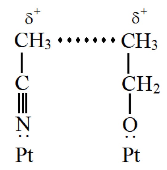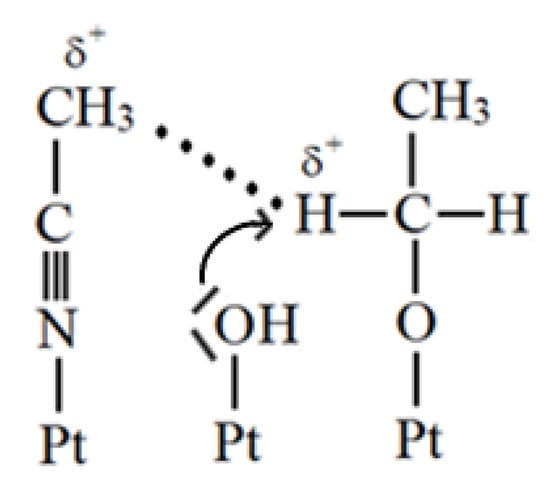 Therefore, it could be concluded that CH3CN (except for the highest 0.25 M concentration) was found to cause significant facilitation of the EOR in NaOH supporting solution, which the authors believe could be due to additional [CH3…..H] interactions (facilitating alcohol dehydrogenation) between the surface-adsorbed species, as illustrated in Scheme 2 below. This finding could additionally be supported by a radical difference in the recorded voltammetric current-densities between acidic and alkaline supporting electrolytes, as shown in Figure 1a,b, correspondingly. In addition, as argued by Briega-Martos et al. in Ref. [] (on the role of acetonitrile in electrocatalytic enhancement of the HCOOH oxidation reaction), the fact that relatively low acetonitrile concentrations lead to EOR facilitation might also result from the so-called CH3CN “promoting effect”, due to its ability to block Pt sites from the extended formation of COAds species or through stabilizing dipole–dipole interactions with the surface-adsorbed reaction intermediates, e.g., acetaldehyde.