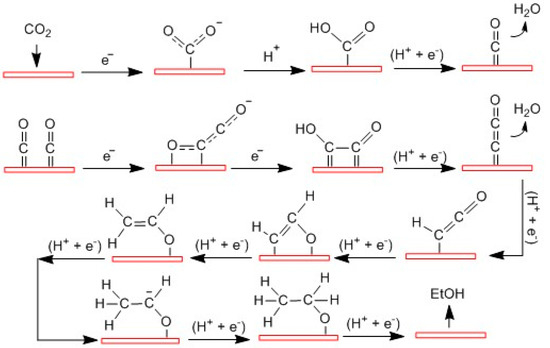 Although numerous efforts have already been devoted to discover the intermediates and products involved in the CO2 reduction process, the various proposed mechanisms of ethanol production indicate that more definitive studies are required.