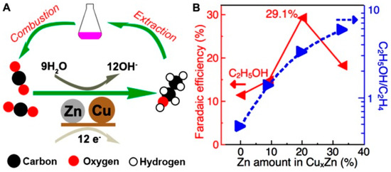 (A) Scheme illustration of CO2 electroreduction process on CuxZn alloys. (B) The maximum faradaic efficiencies of ethanol and FEethanol/FEethylene ratios on different CuxZn alloy catalysts. Reproduced with permission [44]. Copyright 2016, American Chemical Society.