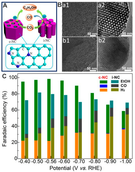 (A) Illustration of cylindrical mesoporous nitrogen-doped carbon (c-NC) and the inverse mesoporous N-doped carbon (i-NC) for CO2 electroreduction. (B) TEM images of (a1,a2) c-NC and (b1,b2) i-NC viewed along (a1,b1) (110) and (a2,b2) (100) directions. (C) FEs of CO2 electroreduction products over c-NC and i-NC catalysts at various applied potentials. Reproduced with permission [81]. Copyright 2017, Wiley.