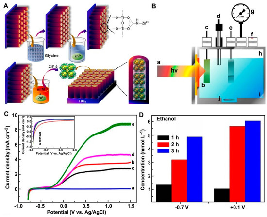 (A) Schematic illustration of ZIF-8 formation on Ti/TiO2NT. (B) Photoelectrocatalytic CO2 reduction reactor used in all experiments: (a) 125W mercury vapor lamp; (b) quartz window; (c) working electrode; (d) reference electrode; (e) counter electrode; (f) septum; (g) manometer; (h) headspace; (i) supporting electrolyte; (j) magnetic bar. (C) Linear scanning voltammograms of the electrodes at a scan rate of 10 mV·s−1 in 0.1 mol·L−1 Na2SO4: (a) both electrodes in the dark; (b) Ti/TiO2NT without CO2; (c) Ti/TiO2NT with CO2; (d) Ti/TiO2NT-ZIF-8 without CO2; (e) Ti/TiO2NT-ZIF-8 with CO2. (D) Concentrations of ethanol generated on Ti/TiO2NT-ZIF-8 electrode by photoelectrocatalytic CO2 reduction for 3 h with bias potentials of −0.7 V and +0.1 V vs. Ag/AgCl, in 0.1 mol·L−1 Na2SO4. Reproduced with permission [116]. Copyright 2018, Elsevier.