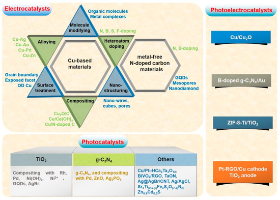 According to the variety of renewable solar energy assistance, CO2-to-ethanol conversion can be divided into three major categories: electrocatalytic reduction by an electrolyzer powered by commercial photovoltaic (PV) devices, photocatalytic reduction by an efficient photocatalyst, photoelectrocatalytic reduction by a semiconducting photocathode and an electrolyzer [12]. Over the past decades, numerous efforts have been devoted to researching the three kinds of CO2 reduction techniques for the production of clean fuel ethanol [13,14,15,16]. Different from C1 products (CO, CH4, formate, methanol, etc.), the multiple electron–proton transfers involved with ethanol production from CO2 have been reported with low efficiency due to the kinetic barriers. Typically, multiple electron–proton transfer steps must be orchestrated with their own associated activation energies, thus presenting kinetic barriers to the forward reaction [12]. Therefore, efficient and robust electrocatalysts, photocatalysts and photoelectrocatalysts are required to promote this kinetically sluggish reduction process.
