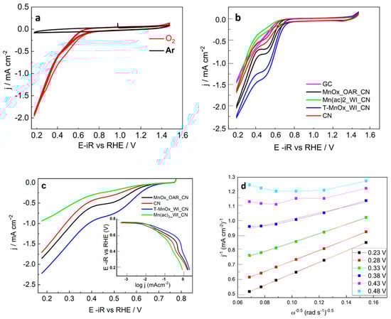 (a) Cyclic voltammetry for T-MnOx_WI_CN mixed with activated carbon under O2 and N2 saturated 0.1 M KOH solution at a scan rate of 20 mV s−1; (b) cyclic voltammetry (CV) for all the samples (without addition of activated carbon) under O2 saturated 0.1M KOH solution at a scan rate of 20 mV s−1; (c) linear voltammetry (LV) for all the carbon nitride (CN) samples (without addition of activated carbon) using a rotating disk electrode in O2 saturated KOH solution at a scan rate of 5 mV s−1 and (inset) corresponding Tafel plot; (d) Koutecky–Levich-plot for T-MnOx_WI_CN constructed from LV data measured at 400, 625, 900, 1225, 1600, and 2025 rpm.