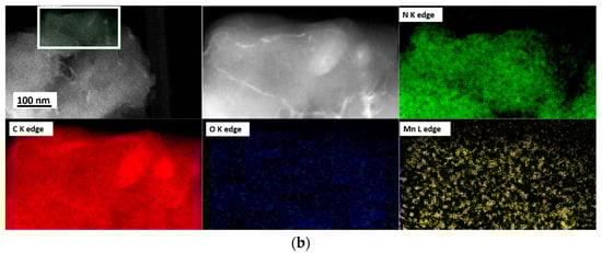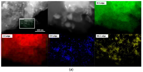STEM images in bright field (BF) and dark field (DF) mode are shown in Figure 2a–d for samples prepared by impregnation method (T-MnOx_WI_CN) and oleic acid route (MnOx_OAR_CN), respectively. EELS mappings at the CK, OK, NK, and Mn L edges for the two samples are also shown in Figure 3a,b, respectively. For the impregnation route, higher contrast regions reveal the presence of large particles with irregular morphologies (darker region in the HAABF-STEM in Figure 2a and brighter region in the HAADF-STEM image in Figure 2b, respectively). These are confirmed as a Mn oxide phase by EELS elemental mapping (Figure 3a). In contrast, in MnOx_OAR_CN, the higher contrast regions in Figure 2c,d do not provide a clear picture of the morphology of Mn oxide NPs and their size. From the high-resolution STEM images in Figure 4 one could also conclude that very small NPs including sub-nanometer NPs are present only in the case of MnOx_OAR_CN and these appear to have a preferential localization which one could consider to account for the exposed surface of the support. The elemental mapping for this sample in Figure 3b shows a rather homogeneous distribution of Mn indicating not only the presence of Mn oxide nanoparticles in the nm range but also of a few Mn atom clusters. Figure 4a shows NPs on the CN support for T-MnOx_WI_CN, where there is no indication for the presence of low nuclearity Mn species on the support. The contrast variation in the image of Figure 4b is very different than in Figure 4a. Such a contrast variation indicates that the size of the NPs immobilized on MnOx_OAR_CN is smaller than in the case of T-MnOx_WI_CN, ranging from few nm particles to small cluster and possibly also single atom species. This is expected as the impregnation of the metal precursor is followed by a thermal annealing to decompose the acetate into an oxide phase, which will also favor sintering. Indeed, the use of a surfactant during the synthesis of NPs has the purpose of preventing the poor size control and agglomeration typically observed in wet impregnation [,]. The quantitative elemental analysis expressed in atom% as determined by EELS is reported in Table 2. The high concentration and homogeneous distribution of N in these samples is confirmed, with a C:N ratio very close to 1. However, note that it is not possible to obtain information on the CN phase based on the C:N ratios due to fact that the synthetic procedure for the immobilization of the Mn oxide NPs introduces additional C impurities. Moreover, from the elemental analysis, the Mn:O ratio for the MnOx_OAR_CN is 1:6 and therefore one could infer low nuclearity Mn species including single atomic species are also present on this sample.