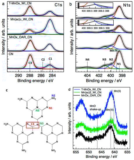 In contrast, the carbon C1s spectra differ more substantially. The least affected by the MnOx immobilization are the MnOx_OAR_CN and the T-MnOx_WI_CN samples. In the former case, we do not expect significant changes due to the fact that the NPs are preformed and simply adsorbed on the support. The slight enhancement of the lower BE component in the C1s spectra for these samples could be due to some disruption of the carbon nitride at the sp3 N atoms linking the tri-s-triazine ring subunits as a consequence of the preparation, i.e., the reaction of Mn with the support during the thermal annealing that favors the removal of N species. Moreover, additional carbon impurities, i.e., oleic acid used in the synthesis of the NPs in the case of the MnOx_OAR_CN can also lead to an increase in the C1 peak. We note that the main C1 component in these spectra is much broader than the C=C component in graphite [] and we expect that some of the C=N bonding configurations and C=O bonding configuration are included in this C1 component.