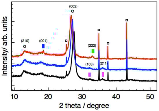 In situ Temperature programmed XRD of sample T-MnOx_WI_CN under N2 at room temperature (black), 300 °C (blue) and 500 °C (red). Peak assignment is as follows: (□) Al2O3; (○) CN; (▌) Mn3O4; (▌) Mn(OH)2; (▌) Mn2O3.