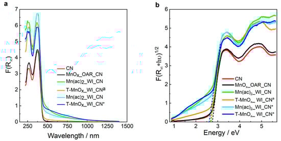 For treated CN, the UV-vis reflectance spectrum in Figure 7a shows the absorption edge around 488 nm, which is close to values which have previously been reported for carbon nitride []. The variation in light absorption with preparation route and treatment temperature is significant. The MnOx_OAR_CN sample shows the smallest change from the CN. Moreover, these show a lower wavelength than any impregnated catalyst. The addition of Mn acetate on CN via impregnation produces the appearance of absorption features above 500 nm and an apparent shift of the absorption edge to a higher wavelength (see Mn(ac)2_WI_CN, Mn(ac)2_WI_CN* and T-MnOx_WI_CN* in Figure 7a, where CN* refers to CN used without the 500 °C pretreatment) whereas the post-impregnation thermal treatment at relatively higher temperature causes the disappearance of the absorption at high wavelength (500 °C for T-MnOx_WI_CNa in Figure 7, where CNa refers to a sample with 500 °C post treatment rather than 200 °C). In addition, the absorption of the impregnated samples is significant even at high wavelength (around 50% reflectance at 800 nm). A broad absorption band in the wavelength range 400–700 nm was reported for small Mn oxide NPs [] but also for CN thermally treated above 550 °C to increase the graphitic order of the material.