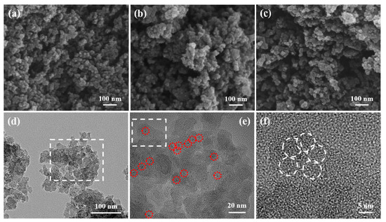 Scanning electron microscopy (SEM) and transmission electron microscopy (TEM) were performed to observe the morphology of the MoC-BN/C samples (Figure 1). The particle size was relatively unaffected by the heat-treatment temperature. Approximately 20 nm spherical carbon nanoparticles were agglomerated with each other homogeneously (Figure 1a–d). In Figure 1e, the red circles indicate the molybdenum carbides of ~5 nm in the carbon matrix, where Figure 1f shows that the 20 nm carbon particle consists of several 5 nm carbon nanoballs. Energy dispersive X-ray spectroscopy (EDS) images of Figure S1 show that boron and nitrogen were doped uniformly into the carbon matrix, and molybdenum was also dispersed homogeneously.