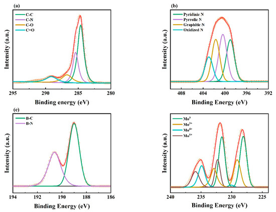 The chemical composition of 800 MoC-BN/C was identified by X-ray photoelectron spectroscopy (XPS) (Figure 3). Before the deconvolution of each peak, the XPS spectra were calibrated using the C 1s peak (~284.6 eV). Figure 3a shows that the C 1s was composed of four types of bonding: C–C (~284.6 eV), C–N (~285.4 eV), C–O (~286.7 eV), and C = O (~289.2 eV) [40]. In the C 1s spectrum, the C–C bonding was the most dominant peak. The N 1s spectrum was deconvoluted into pyridinic N (~399.0 eV), pyrrolic N (~400.4 eV), graphitic N (~401.7 eV), and oxidized N (~403.0 eV) [41,42]. These various bonding types were fabricated using quinoline as the precursor in plasma engineering. The B 1s spectrum was deconvoluted simply into two peaks: B–C (~189.0 eV) and B–N (~190.6 eV) [43,44]. In the B 1s spectrum, the B–C peak was higher than the B–N peak with showing the peak area ratio B–C: B–N = 1.47: 1. This means that most of the boron atoms were bonded with carbon atoms, but the number of boron atoms bonded with nitrogen atoms was also not little. Molybdenum can have various oxidation states. The Mo 3d peak could be deconvoluted into four peaks: Mo0 (~228.1 eV and~231.6 eV), Mo3+ (~229.1 eV and~232.9 eV), Mo4+ (~230.1 eV and~234.9 eV), and Mo6+ (~232.3 eV and~235.9 eV) [45,46]. The presence of especially high metallic molybdenum (Mo0) in 800 MoC-BN/C would be contributed to the high OER catalytic activity [23].
