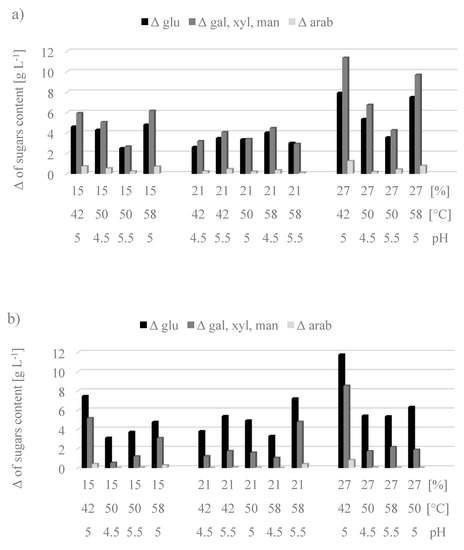The increase in sugar concentration (Δ) after the enzymatic hydrolysis process in relation to their amount after the applied prehydrolysis process is presented in Figure 1. Enzymatic saccharification was carried out under various conditions (substrate concentration, temperature, and pH) with the synthesized enzyme C1 (a) and the commercial enzyme preparation CTec2 (b). Concentrations of a mixture of galactose + xylose + mannose and of arabinose were higher in the hydrolysates made with C1 preparation, compared to the commercial CTec2 preparation, except for the variant with the medium concentration of the substrate (21%) hydrolyzed at 58 °C and pH 5.5. In turn, in hydrolysates produced with the CTec2 preparation higher concentrations of glucose were obtained as a result of dominant cellulolytic activity. This had a direct impact on the efficiency of the hydrolysis process calculated in relation to glucose, and in the experiment involving CTec2 preparation, its value ranged from 9.25% (run 10) to 16.93% (run 1) (data not shown).